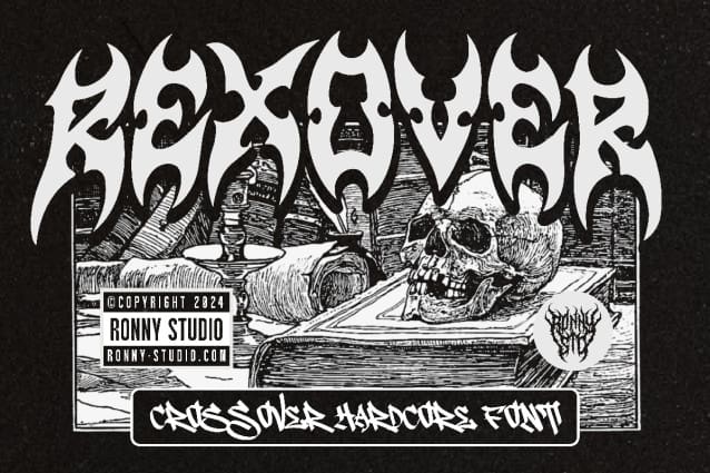 Rexover Crossover Hardcore Font is a cool alternative for you to create Underground band logos or anything else easily. Using effects in the font will liven up the font and it will look cooler and fiercer. This font has a strong, aggressive and bold look, reflecting the aesthetics of the metal music genre itself. This font is very suitable for band logos, poster designs, t-shirt designs, jackets, hats, beanies, etc