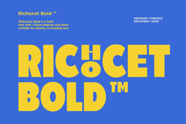 Richocet Bold Font is a massive, high-impact display typeface designed to make your message impossible to ignore.Inspired by the chunky aesthetics of retro-futurism and the Y2K design revival, Richocet Bold delivers a maximum-weight punch with a unique twist. Its solid, heavyweight structure is subtly disrupted by distinctive geometric in-line cutouts—like small, precise ricochets—giving it a dynamic, almost tech-focused energy.