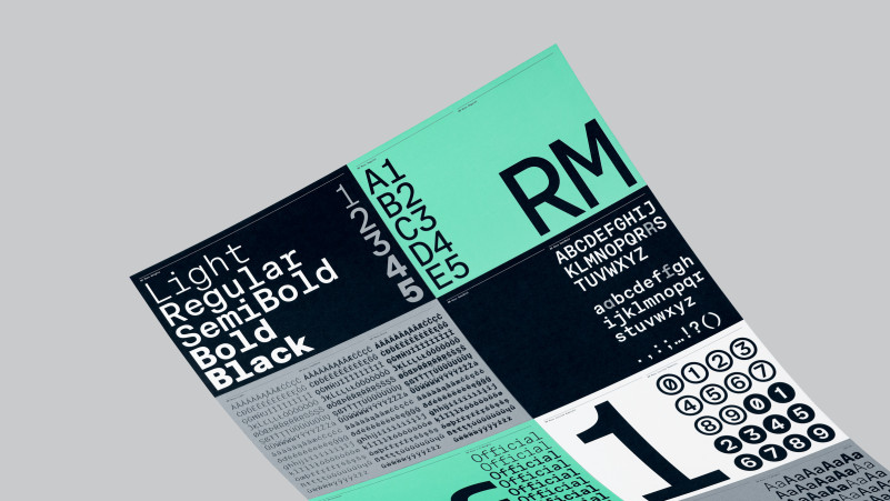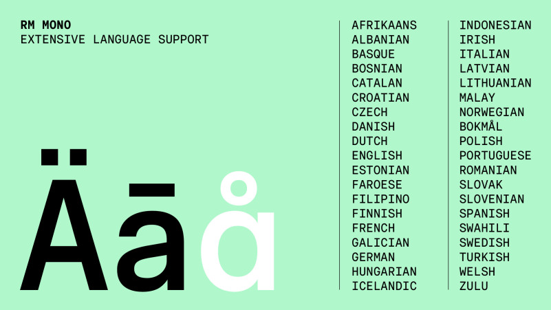 RM Mono is available in 5 weights, ranging from Light to Black, matching the weights of its sister family, RM Neue. The extensive language support (Latin Extended A) allows type setting in most European languages written with the Latin script