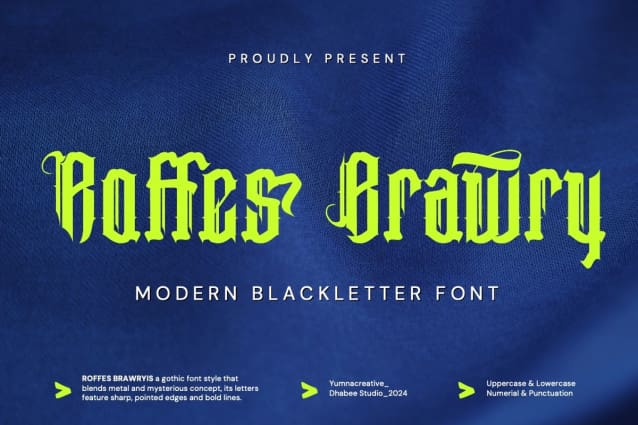 Roffes Brawry font is made for personal use. Get the full version of the fonts if you want to use it for commercial purposes by purchasing the licenses here: https://creativemarket.com/habibie.habibie1532/291051909-Roffes-Brawry-Modern-Blackletter?u=fontlot123