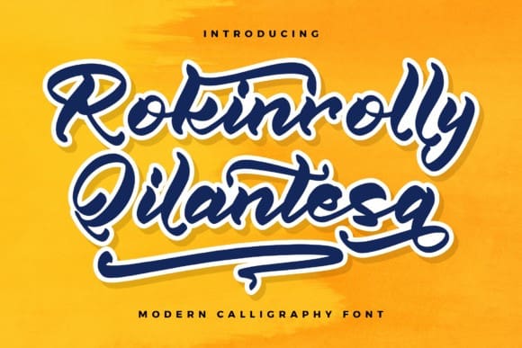 Rokinrolly Qilantesa Font – Modern Calligraphy Font , from Glorytype Studio, suitable for any projects such as: logos, branding projects, homeware designs, product packaging, mugs, quotes, posters, shopping bags, t-shirts, book covers, name card, invitation cards, greeting cards, label, photography, watermark, special events, and all your other lovely projects that need a beautiful script taste.