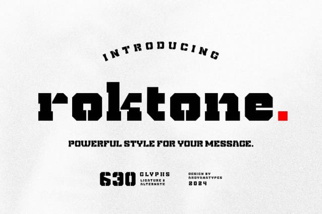 Roktone Font is a display block typeface meticulously crafted and inspired by various modern styles to deliver an optimal combination of aesthetics and functionality. With its bold and strong character, Roktone remains flexible enough to be applied across different design styles. Featuring advanced OpenType capabilities, Roktone offers a variety of customizable characters, allowing designers to fully express their creativity.