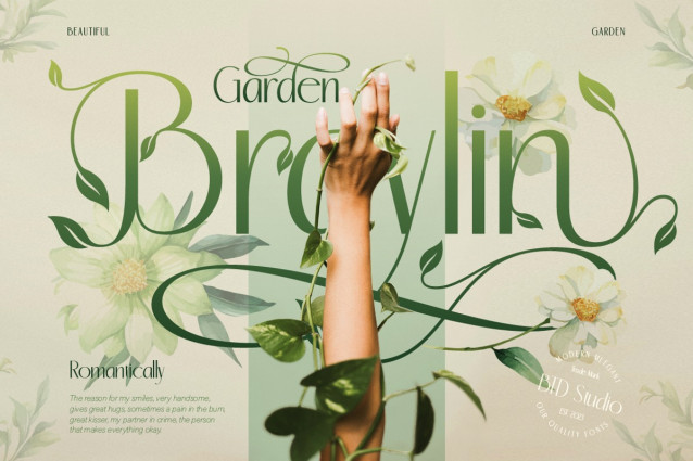 Rolyna Font, a fresh, nature-inspired display font that combines modern sophistication with elegant botanical charm. Rolyna comes in two distinct styles: Regular for a clean look, and Aley with decorative swashes and leafy details, perfect for those who love a whimsical, organic feel. Its tall letterforms and nature-inspired flourishes create a unique visual identity that feels both graceful and playful, like vines growing on a fairytale garden gate. Rolyna is ideal for skincare and botanical logo designs, herbal packaging, eco-friendly branding, wedding invitations with a garden or rustic theme, romantic editorial titles, fashion layouts, greeting cards, journals, and many other creative projects.
