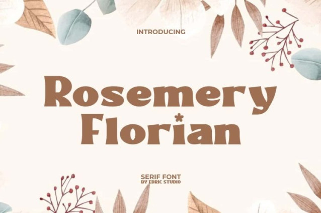 Rosemery Florian Font is a playful fat bold serif display font with an fun style that features a beautiful rosemary flower theme. The beautiful shape and design are specially crafted to fit your editing creations, so this perfect font can be used in apps, blogs, brand logo, brochure, covers, embossed design, flyer, headers, headline, label product, poster, template, title, website, and much more.