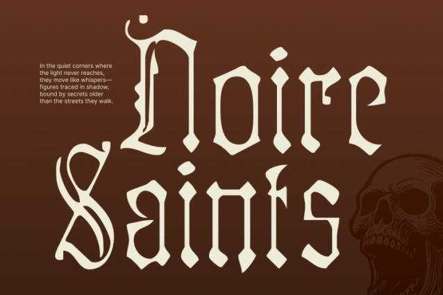 What sets this font apart is its expressive drawn texture, adding a handcrafted touch that enriches every letter with depth and personality. The imperfect, artistic texture brings warmth to the bold blackletter form, making the typeface feel more human and visually engaging. This handmade quality enhances its dramatic nature, giving designs a unique blend of heritage charm and creative flair.