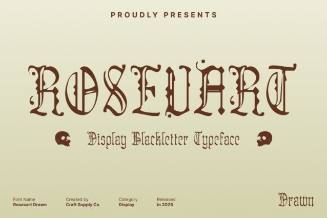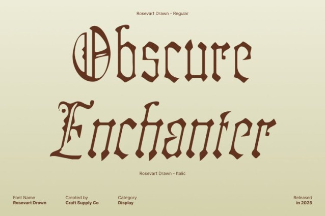 Rosevart Drawn Font This font is a decorative blackletter display that embraces the dramatic elegance of traditional gothic typography. Its sharp angular strokes, pointed curves, and ornamental detailing create a striking visual presence that instantly commands attention.