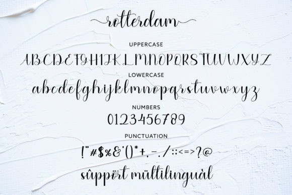 Rotterdam Script Font is a romantic and sweet calligraphy typeface with characters that dance along the baseline. It will add a luxury spark to any design project that you wish to create! This font is PUA encoded which means you can access all of the amazing glyphs and ligatures with ease!