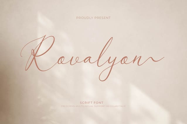 Rovalyon Script Font | Handwriting Font, from Gracetypestudio, suitable for any projects such as: logos, branding projects, homeware designs, product packaging, mugs, quotes, posters, shopping bags, t-shirts, book covers, name card, invitation cards, greeting cards, label, photography, watermark, special events, and all your other lovely projects that need a Handwriting Font taste.