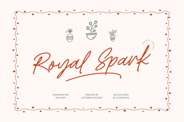 Royal Spark Handwriting Font is a relaxed handwritten ink font crafted with natural strokes, smooth curves, and an organic flow that brings a warm, personal touch to any design project. Featuring 110 ligatures and 26 stylistic alternates, this typeface captures the charm of authentic handwriting while offering the flexibility needed for branding, invitations, packaging, logos, quotes, greeting cards, and lifestyle-inspired layouts. Its effortless movement, playful irregularities, and subtle ink texture make Royal Spark perfect for designers seeking a friendly, modern script with character and authenticity, ideal for projects that need both personality and elegance.