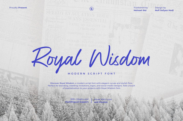 Royal Wisdom Handwriting Font is a modern script font that exudes elegance and sophistication. With its smooth curves, graceful strokes, and stylish flow, this font is perfect for adding a luxurious touch to your design projects. Ideal for branding, wedding invitations, logo design, social media posts, and product packaging, Royal Wisdom brings a sense of class and creativity to any visual concept. Its modern calligraphic style makes it stand out, offering both readability and artistic charm for professional and personal designs.