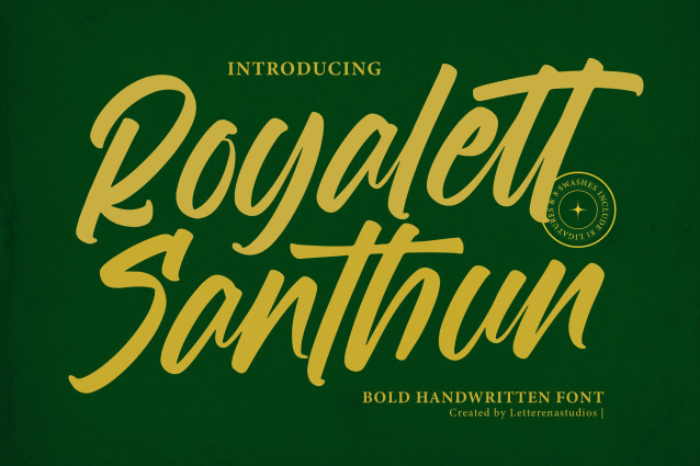 Royalett Santhun Font – Bold Handwritten Font , from Letterena, is a Luxury Script font, suitable for any projects such as: logos, branding projects, homeware designs, product packaging, mugs, quotes, posters, shopping bags, t-shirts, book covers, name card, invitation cards, greeting cards, label, photography, watermark, special events, and all your other luxury and beautiful projects that need a Luxury Script taste.