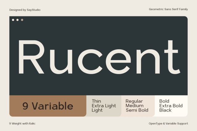 Rucent Font is a modern geometric sans serif typeface crafted to deliver clarity, elegance, and contemporary strength in every design. Built with precise proportions, smooth curves, and clean structures, this font family offers a balanced visual tone that feels professional, minimal, and timeless. With 9 variable weights and full italic support, Rucent provides exceptional flexibility, allowing designers to create dynamic visual hierarchies across digital and print projects with ease.