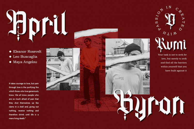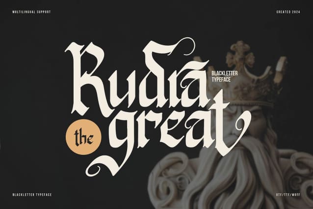 Rudra Great | Blackletter Typeface, from Denustudios, suitable for any projects such as: logos, branding projects, homeware designs, product packaging, mugs, quotes, posters, shopping bags, t-shirts, book covers, name card, invitation cards, greeting cards, label, photography, watermark, special events, and all your other lovely projects that need a Blackletter Typeface taste.