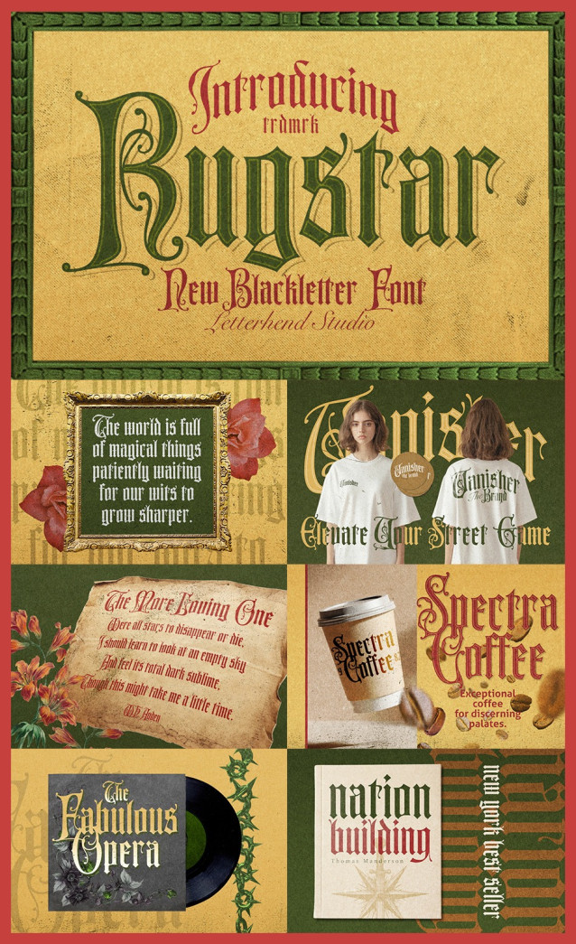Rugstar Blackletter Font is a meticulously crafted blackletter typeface that captures the spirit of classic calligraphy and medieval design. With its tall, ornate letterforms and dramatic serifs, it evokes a sense of mystery, authority, and elegance. Ideal for wine labels, book covers, vintage logos, metal band merchandise, or any design that needs a bold and timeless voice with gothic flair.