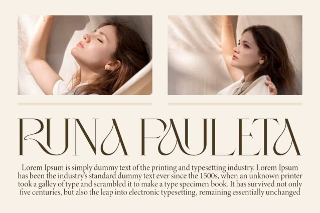 Runa Pauleta Font is a serif display font that emphasizes elegance and a distinctive artistic touch. With its slender letter characters and subtle decorative details, this font gives a luxurious and modern impression. This font will be perfect for any projects, can be used for signage, cover, advertising, brand image, custom design, invitation, label, layout design, quotes, stationery, template design, website, and more!
