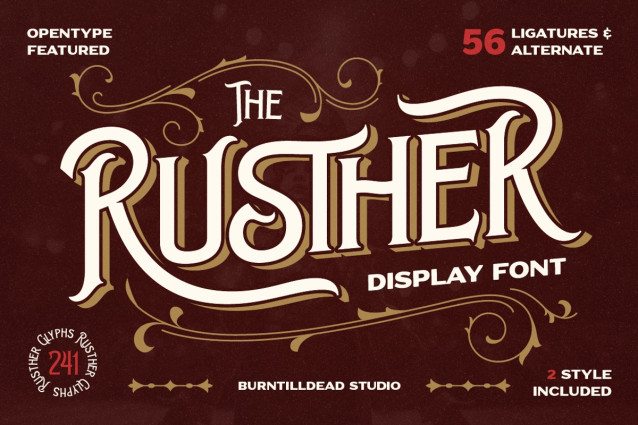 Rusther Font, is a bold display font with a classy twist. Inspired by vintage lettering and a touch of Victorian simple vibes, this font brings drama and elegance without being too extra. Its stylish ligatures, clean curves, and ornamental details make it perfect for posters, wine labels, logos, or anything that needs a timeless stage-ready look. If you’re going for retro elegance, old-theater charm, or modern vintage branding, Rusther will make your design shine with simple Victorian flair.