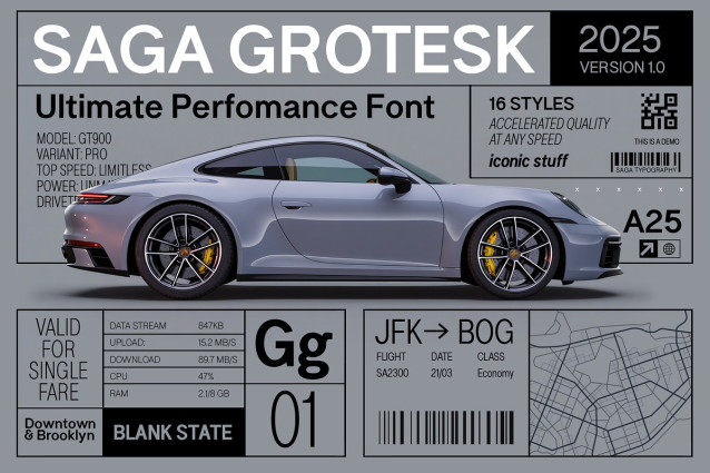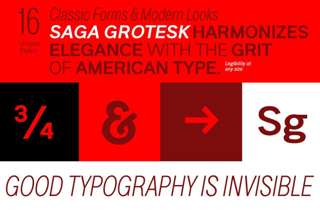 Saga Grotesk Font Family is a sans serif family of 16 styles, ranging from Light to Black, and from Condensed to Normal widths. Designed on proportions derived from the golden ratio, it balances the timeless clarity of neo-grotesques with subtle contemporary refinements. In heavier weights, apertures open slightly wider and stroke terminals are angled to improve legibility in dense text, while in lighter and regular styles terminals remain straight, preserving a clean, classic tone. The double-storey “g” and traditional two-storey “a” emphasize its typographic heritage, distinguishing Saga Grotesk from simplified modernist grotesques. Rooted in harmony and proportion, Saga Grotesk is equally suited for long-form text and impactful headlines, bridging European precision with the bold pragmatism of American grotesques.