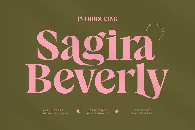 Sagira Beverly Font – Bold Tall Serif Font,Sagira Beverly is a bold tall serif font that combines modern sophistication with timeless elegance. With 29 ligatures and 40 alternates across two styles (Regular and Italic), it offers flexibility for creating striking headlines, refined logos, and stylish editorial layouts. Perfect for fashion branding, magazine covers, posters, and packaging, Sagira Beverly delivers a confident and elegant typographic statement for any creative project.