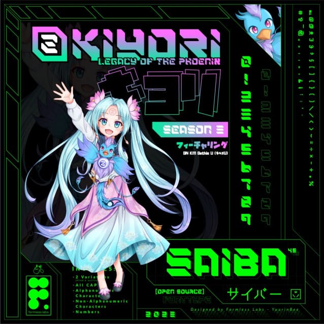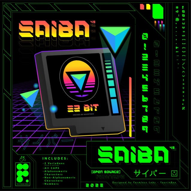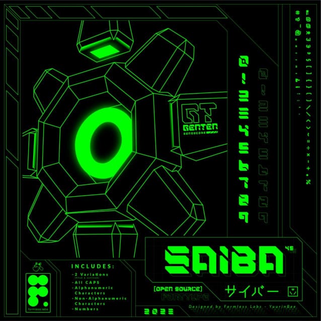 Saiba-45 Futuristic Font is a display font that was inspired by CyberPunk, NeoTokyo, Mecha, Manga/Anime, Retro, Tech, and Futuristic styles. It was intended to be used for short-form and large-format displays, but not limited to this type of application. Efficient ways to experiment with this font are provided in graphic examples below, but include: distinct logotypes, stylized names and text, unique vector characters, bold titles, and more. The name SAIBA was chosen as the “katakazination” (transforming English to Katakana) of the English word “Cyber” to be pronounced with Japanese vowels and syllables. The word cyber translates to サイバー in Japanese, which is pronounced as “Saiba”. The 45 in SAIBA-45 is reflective of the 45 degree angles used to create the prominent edges, defining the look and feel of the font.