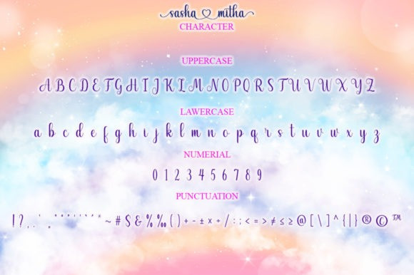 Sashamitha Script Font is a romantic and sweet calligraphy typeface with characters that dance along the baseline. It will add a luxury spark to any design project that you wish to create! This font is PUA encoded which means you can access all of the amazing glyphs and ligatures with ease!