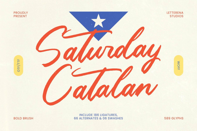 Saturday Catalan Script Font is a bold brush script font crafted with energetic strokes, handcrafted texture, and expressive movement, offering 186 ligatures, 66 alternates, and 6 swashes to create a dynamic, authentic handwritten look. Designed for striking branding, retro-inspired layouts, café packaging, posters, social media visuals, and lifestyle merchandise, this typeface delivers a charismatic balance of boldness and fluidity, making it ideal for designers seeking a confident brush script with strong visual personality.