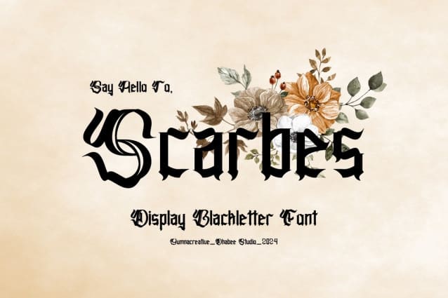 Scarbes Blackletter Font. This Font is a delicate, elegant and flowing handwritten font. It has beautiful and well as a unique blend of ligatures a letter, so that the authors compose it with a and little swirly embedding, so that a modern font is formed and ready to make a statement by adding elegant and unique flair to your next design project. Add it to your most creative ideas and notice how it makes them come alive!