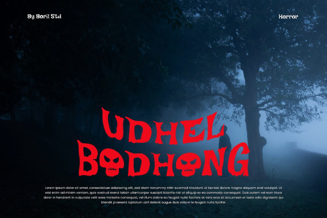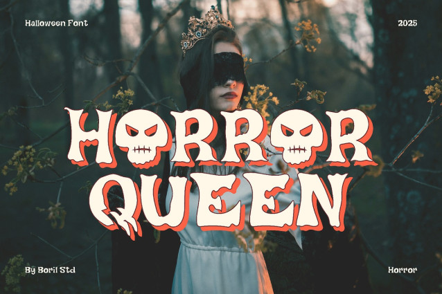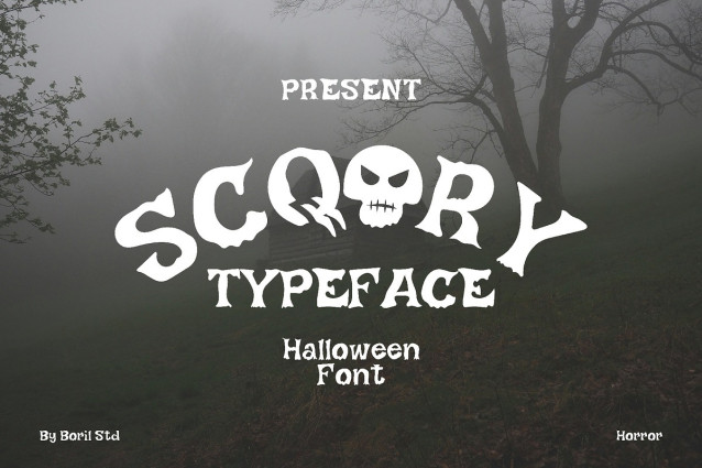 Scqory Halloween Horror Font – This Scqory font has a strong horror and gothic style, suitable for Halloween themes, mysteries, or scary themed content, Bold and irregular, Each letter has a rough, asymmetrical, and wavy shape, giving an unstable and scary impression, The capital letter “O” is replaced with a skull, while the “Q” has an effect like a monster’s claws or tail.