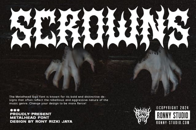 Scrowns Metalhead Font: Known for its bold and distinctive design, capturing the rebellious and aggressive spirit that is characteristic of the metal music genre. This font is crafted to add a fierce and powerful look to any design, making it ideal for band logos, album covers, posters, and other music-related graphics.