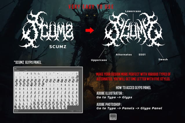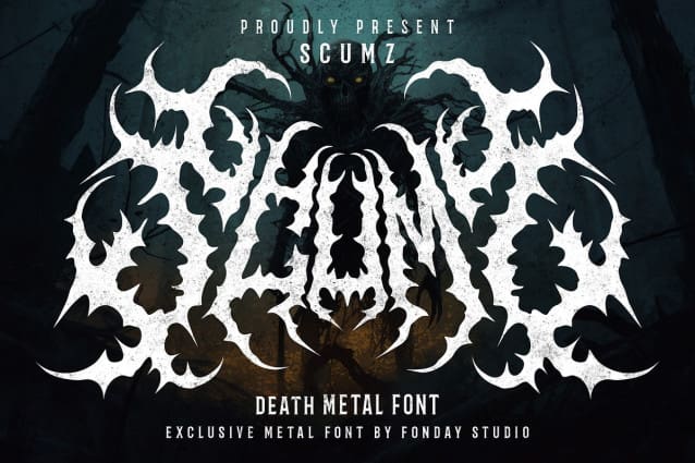 SCUMZ’s unique style will make your designs stand out, with its sharp and striking letterforms. Whether you’re creating album covers, band logos, or promotional materials for a metal band, SCUMZ will give your designs a memorable look that captures the essence of metal music.