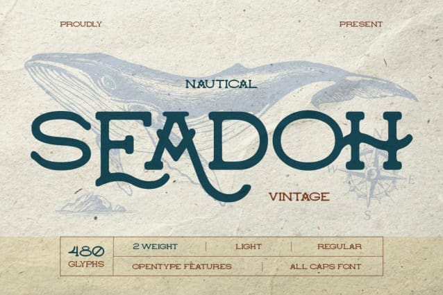 Seadoh Vintage Font, inspired by maritime themes. This font combine modern look and sense of adventure. Seadoh charaterized of bold and chunky letters make it look vintage and retro feel. With 2 weight, light and regular, this font ideal for any kind project that need a touch of the sea, such as logo, poster, greeting card, signage, headline/titles and many more.