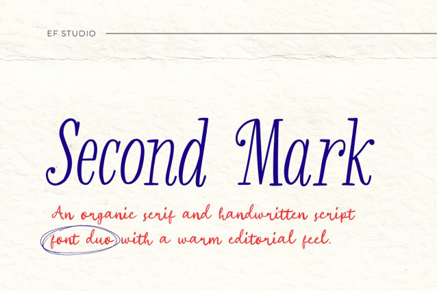 Second Mark Font Duo is a font duo combining an organic serif with a raw handwritten script. The serif is designed for readability and editorial structure, while the script functions as a secondary accent for notes, captions, and expressive details. With natural stroke variation and a handcrafted feel, Second Mark is well suited for editorial layouts, zines, photography books, journals, posters, and branding projects that require a quiet, human touch.