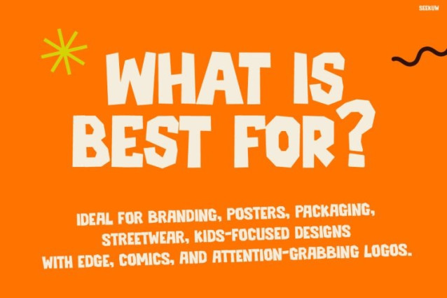 SEEKUW is built for expressive display use. First, it performs strongly in headlines and posters. Additionally, it works well for packaging and branding visuals. The font includes uppercase letters, numbers, and essential symbols. Because of this, it supports real design needs. Moreover, its cartoon-inspired style feels friendly and modern. However, it still maintains a bold presence. Furthermore, the rugged edges add texture without reducing clarity. As a result, Kids Font SEEKUW feels lively and authentic. Meanwhile, its strong structure ensures consistent results across print and digital media.