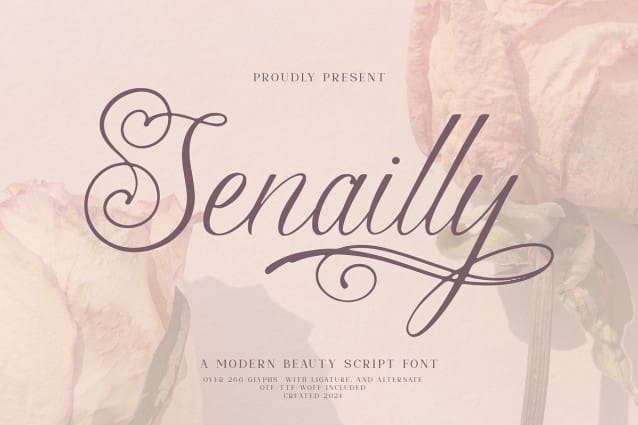 This font is made for personal use. Get the full version of the fonts if you want to use it for commercial purposes by purchasing the licenses here: https://creativemarket.com/Denustudios/287079539-Senailly-Modern-Beauty-Script?u=fontlot123