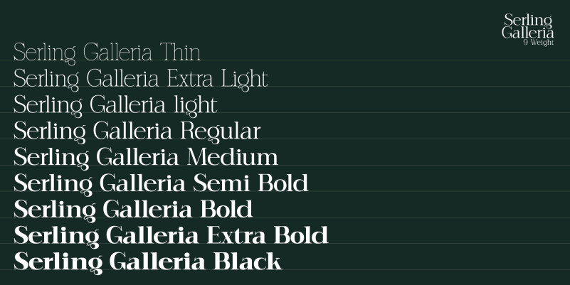 Serling Galleria Font , is a classy, classic serif font that exudes an air of fine art and high-end creativity. With its clear, legible letterforms and modernist inventiveness, Serling Galleria brings a touch of strict creativity to your designs, making them stand out in sophistication.