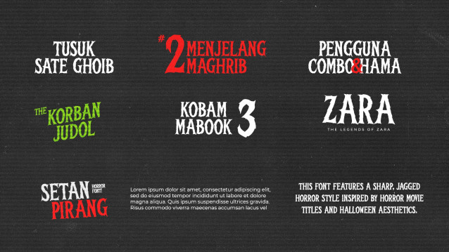 Setan Pirang Font is a font that exudes horror and suspense in its design. This chilling typeface seamlessly blends elements of fear and mystery, making it the perfect choice for projects that want to evoke a sense of gloom and foreboding. The letters are meticulously crafted with jagged edges, irregular strokes, and unsettling angles, all contributing to the overall unsettling feel.