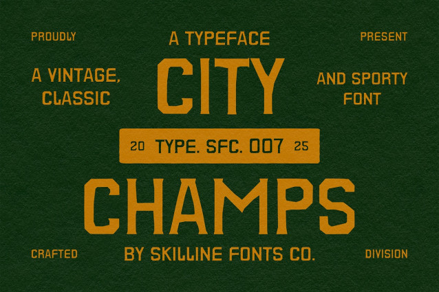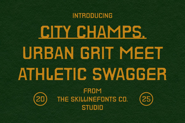 City Champs is made for designers and brands who want to capture the power and nostalgia of athletic typography. It’s especially strong for sports team branding, gym apparel, motivational posters, and editorial layouts with a bold statement. Its vintage athletic roots make it a natural choice for merchandise like hats, jerseys, and streetwear, while also shining in logos, signage, and marketing materials that need an instant impact.