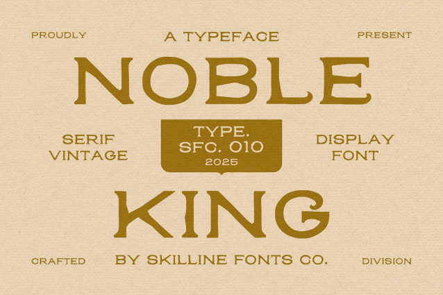 SFC Noble King Font is a bold vintage serif display font inspired by the strength of classic print design, antique signage, and timeless craftsmanship. With its sculpted serifs and refined yet rugged form, Noble King blends old-world charm with a confident modern presence perfect for designers who value authenticity and character.