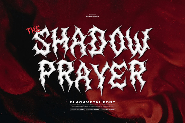 Shadow Prayer Font | Black Metal Font, from Denustudios, suitable for any projects such as: logos, branding projects, homeware designs, product packaging, mugs, quotes, posters, shopping bags, t-shirts, book covers, name card, invitation cards, greeting cards, label, photography, watermark, special events, and all your other lovely projects that need a Black Metal Typeface taste.