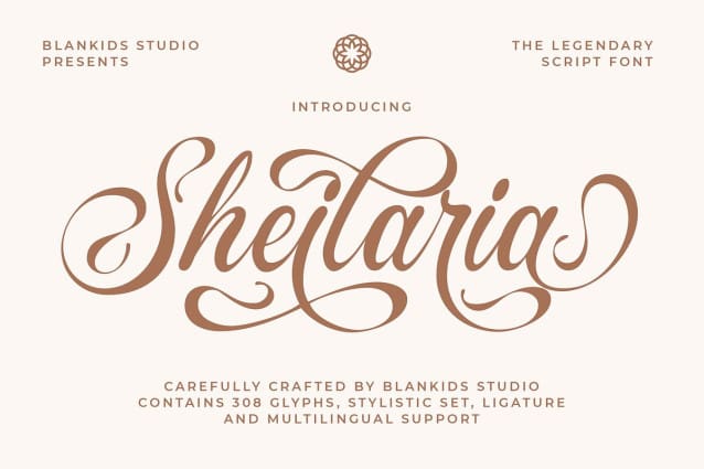 Sheilaria Font a legendary script font is made for any professional project branding, such as logotype, wedding invitation, watermarks, poster, branding, promotions, product packaging, etc. Every letter has a script calligraphy style.