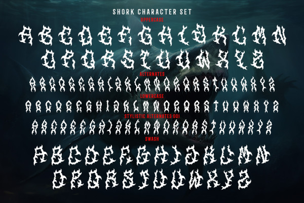 Shork Font, is perfect for creating designs that embody the energy and intensity of metal music, while adding a touch of ferociousness with a shark-inspired twist.