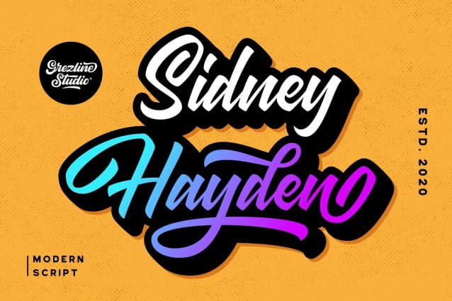 Sidney Hayden Font, is a brand new modern script font that comes with a neat and dynamic looks. Sidney Hayden is perfect use for a logotype, typography design, product packaging, quotes, t-shirt design, label poster, headings, letterhead, cutting sticker, hot stamping, signage,and anything that need modern taste. This font is very easy to use, you can even mix and pair it with other fonts to provide a fresh and authentic looks to your design projects.