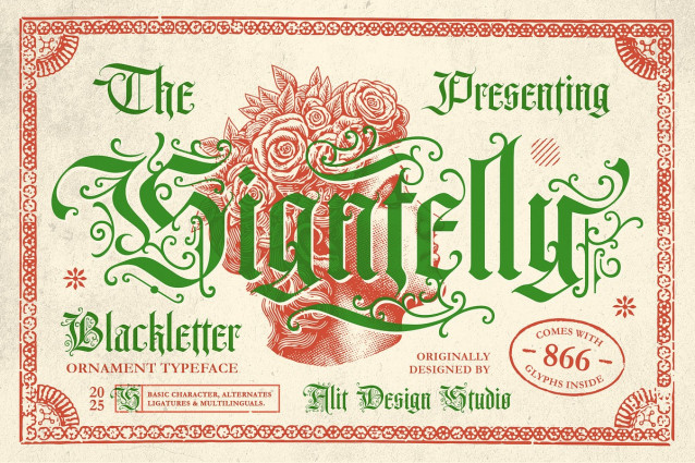 Signtelly Font – a beautifully ornate blackletter typeface inspired by the rich typographic tradition of early European print culture. Channeling the spirit of 15th to 17th-century Gothic script, Signtelly is designed to evoke the feel of antique book pages, meticulously printed with ink and adorned with elegant flourishes.