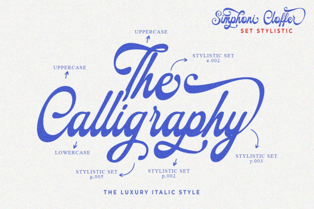 Equipped with style sets, contextual alternates, subtle ligatures, and comprehensive multilingual support, Simphoni Cloffer adds a touch of sophistication to any design project—making it a perfect choice for logos, quotes, invitations, greeting cards, product packaging, letterheads, apparel, web design, magazines, books, and more.