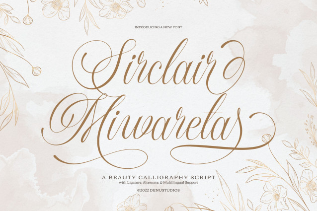 Sirclair Miwareta Script Font | Beauty Calligraphy, from Denustudios, suitable for any projects such as: logos, branding projects, homeware designs, product packaging, mugs, quotes, posters, shopping bags, t-shirts, book covers, name card, invitation cards, greeting cards, label, photography, watermark, special events, and all your other lovely projects that need a Calligraphy taste.