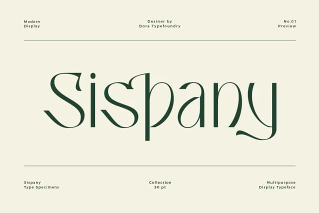 Sispany Font is used only for demos (Demo license). If you want to use this font for commercial use please contact: https://creativemarket.com/DoraTypefoundry/6803950-Sispany-Display?u=fontlot123