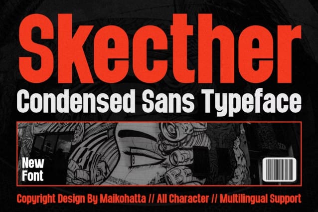 Skecther Font – Condensed Sans Typeface. This font is a type of font that is characterized by narrower or slimmer letterforms compared to regular or wide fonts. Condensed fonts are often used in various graphic designs, print materials, and other media because they have distinct advantages and unique characteristics