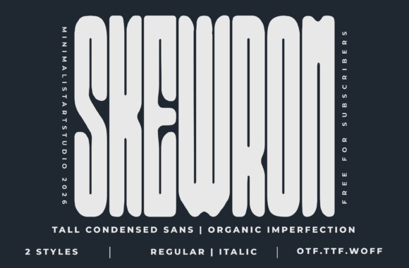 With its clean yet experimental aesthetic, Skewrom is an excellent choice for designers looking to create bold headlines, stylish branding, editorial layouts, and modern poster typography that stands out in both print and digital environments.