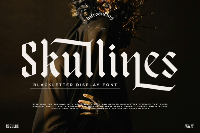 Skullines Font, a bold and refined Blackletter Display Font that blends the timeless allure of Gothic calligraphy with a sharp modern twist. Designed for creators who seek drama, elegance, and edge in their work, Skullines is a versatile typeface that adds character and impact to any design. Perfect for Brand Logo, Album Cover, Branding, Tattoo, Poster, Artwork, Headline, Tittle, Magazine, etc.