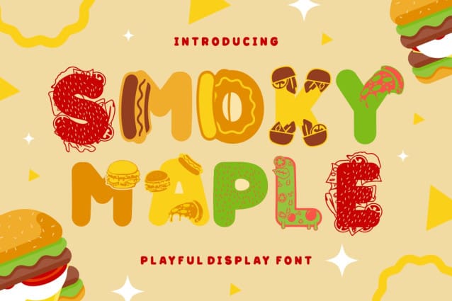 Smoky Maple isn’t just a font; it’s an experience that blends the visual appeal of typography with the mouth-watering allure of fast food. Whether you’re designing packaging, posters, or titles, this font adds a unique and appetizing twist to your creations. Its bold and layered style is reminiscent of the textures and toppings of a classic burger, inviting viewers to savor your designs as they would a gourmet meal. Embrace the playful spirit of Smoky Maple and let your designs leave a lasting impression.