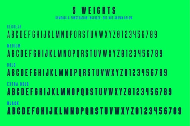 Available in 5 weights in capital letters only. Also included are italicized versions and all basic symbols and punctuation marks.